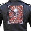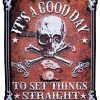 I’m happy and proud to be able to offer this great looking and unique biker patch. It features a white skull with cross bones, pistols and cannon with the words “IT’S A GOOD DAY TO SET THINGS STRAIGHT” on a rustic brown background. It is a great patch with lots of detail. Can be sewn or ironed on. Great for leather or textile jackets, vest, hats, caps, whatever you can think of. A great looking patch that is hard to find. I have this in two sizes: