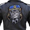 I’m happy and proud to be able to offer this great looking and unique biker patch. It features a skull wearing a cop hat, two guns and pair of handcuffs with a cop badge in the background. It is a great patch with lots of detail. Add to leather or textile jackets, vest, hats, caps, whatever you can think of. Sew or iron onto the item. Measures 9.75 inches wide by 12.25 inches high. This patch really makes a statement in this large size. Also available as medium or small patches. I have this in three sizes: