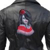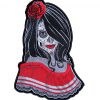 I’m happy and proud to be able to offer this great looking and unique biker patch. It features a day of the dead seductive looking lady with her face painted like a sugar skull, a red rose in her hair and wearing a Mexican folkloric dress in the color red. Can be sewn or ironed on. I have this in two sizes: