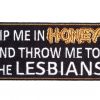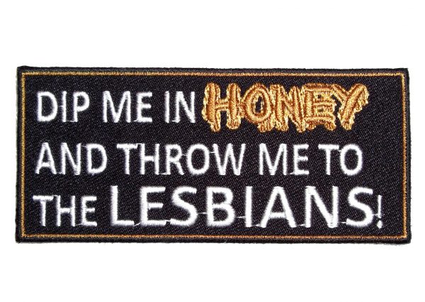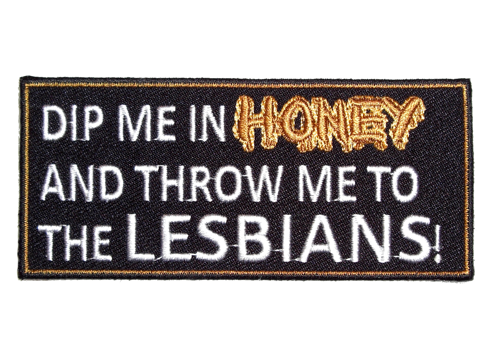 This sexy looking lady biker patch is top quality made. Features the words DIP ME IN HONEY AND THROW ME TO THE LESBIANS! with honey in gold and messy. Can be sewn or ironed on. Measures 4 inches wide by 1.75 inches high.