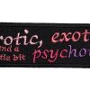 This cool looking biker patch is top quality made. Features the words “Erotic,Exotic, and a little bit psychotic.” Lovely in detail. Can be sewn or ironed on. Great for leather or textile jackets, vest, hats, caps, whatever you can think of. Measures 4 inches wide by 1.25 inches high. A great looking biker patch.