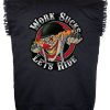 This black denim shirt features a crazy, evil clown with orange hair, red nose and yellow rotten teeth wearing finger-less gloves riding a motorcycle with the words WORK SUCKS LETS RIDE around it. The patch itself measures 11 inches wide by 11.75 inches high. So choose your style and get one or several now, free shipping in the USA!!!