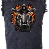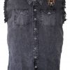 This high quality denim shirt has a button up front, classic collar and two button chest pockets. It is acid-washed for a cool faded charcoal color. The sleeves are cutoff leaving the frayed ends hanging out in classic biker style. Every biker will enjoy wearing this while riding!!!