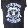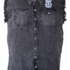 This high quality denim shirt has a button up front, classic collar and two button chest pockets. It is acid-washed for a cool faded charcoal color. The sleeves are cutoff leaving the frayed ends hanging out in classic biker style. Every biker will enjoy wearing this while riding!!!