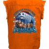 This high quality denim shirt has a button up front, classic collar and two button chest pockets. It is orange in color for a cool biker look for safety. The sleeves are cutoff leaving the frayed ends hanging out in classic biker style. Every biker will enjoy wearing this while riding!!!