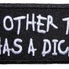 This sexy looking lady biker patch is top quality made. Features the words “My Other Toy Has A Dick” in white letters. Can be sewn or ironed on. Great for leather or textile jackets, vest, hats, caps, whatever you can think of. Measures 4 inches wide by 1.75 inches high. A very sexy lady biker patch for a vest or jacket, check out my other patches too.