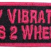 This sexy looking lady biker patch is top quality made. Features “MY VIBRATOR HAS 2 WHEELS” saying in a blurred pink. Can be sewn or ironed on. Great for leather or textile jackets, vest, hats, caps, whatever you can think of. Measures 3.5 inches wide by 1.5 inches high. A very sexy lady biker patch for a vest or jacket