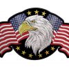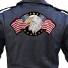 This unique looking biker patch is top quality made. It features an American Bald Eagle with two American Flags and stars. The colors are very bold and adds lots of details. Can be sewn or ironed on. I have this in two sizes: