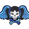 This beautiful looking lady biker patch is top quality made and comes in two sizes. It features a sexy pigtail lady skull, crossbones and blue wings. The colors are bright with lots of details. Can be sewn or ironed on. I have this in two sizes: