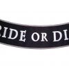 This bottom rocker patch has “Ride Or Die” in white with a gray skull on each side and gray border on a black background. It is a great patch with lots of detail. Can be sewn or ironed on. Measures 12 inches wide by 3.5 inches high.