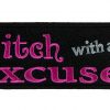 This sexy lady biker patch is top quality made and a new design. It features “Bitch with an excuse!” in hot pink and white text on a black background. Can be sewn or ironed on. Measures 4 inches wide by 1.5 inches high.