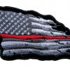This cool looking biker patch is top quality made. Features a distressed style American Flag in a subdued grey color with a red thin line representing firefighters and the fire department. Lovely in detail. Can be sewn or ironed on. Great for leather or textile jackets, vest, hats, caps, whatever you can think of. Measures 4 inches wide by 2.25 inches high. A great looking biker patch.