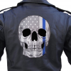 This cool looking biker patch is top quality made. Features a subdued grey skull with the American Flag on his face with a thin blue line.  Lovely in detail. Can be sewn or ironed on. Great for leather or textile jackets, vest, hats, caps, whatever you can think of. I have this in two sizes: