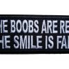 This cool looking biker patch is top quality made. Features the saying “The Boobs Are Real,” “The Smile is Fake” in white letters on a black twill patch . Lovely in detail. Can be sewn or ironed on. Great for leather or textile jackets, vest, hats, caps, whatever you can think of. Measures 4 inches wide by 1.5 inches high. A great looking biker patch.
