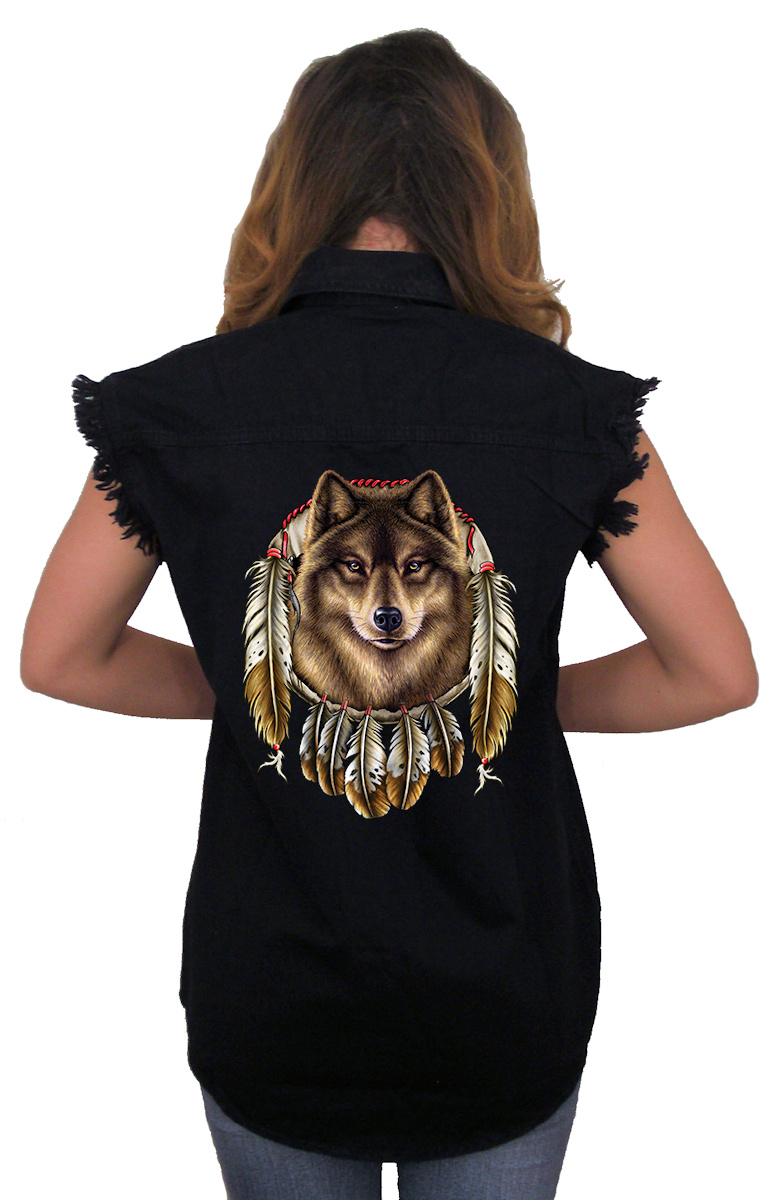 Womens Denim Sleeveless Biker Shirt Native American Wolf Design