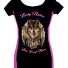 Be the first to review “Women’s Stretchy Fitted Slim Fit Two Tone Lady Rider Wolf Dreamcatcher Live Laugh Ride Scoop Neck Tee Shirt Black/Pink”