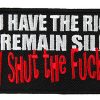 This cool looking biker patch is top quality made and one of my latest designs. It features “You Have The Right To Remain Silent Now Shut The Fuck Up!” in red and white text on a black background. Can be sewn or ironed on. Great for leather or textile jackets, vest, hats, caps, whatever you can think of. Measures 4 inches wide by 2 inches high. A great cool looking patch.